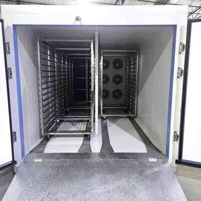 2. Progettato per una disidratazione uniforme: dispone di un sistema di circolazione ad alto volume alimentato da un gruppo di 6 ventole heavy-duty che generano 3000-4500 m³/H di flusso d'aria continuo. I canali del pavimento aerodinamici spingono l'aria secca uniformemente attraverso tutti i 180 vassoi contemporaneamente, prevenendo la formazione di muffe localizzate o un'essiccazione insufficiente.