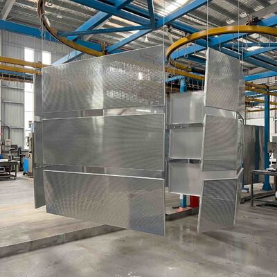 Un sistema di trasporto aereo pesante che trasporta continuamente grandi pannelli metallici attraverso una linea industriale automatizzata di rivestimento in polvere e di cottura.